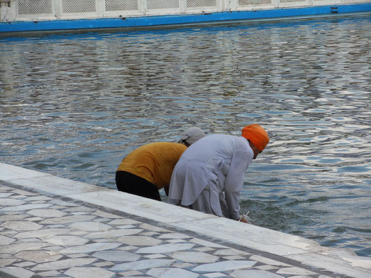 Der Goldene Tempel liegt in Mitten eines rechteckigen Pools, dem Amrit Sarovar (Nektarsee). Von diesem See leitet sich der Stadtname Amritsar ab. Das Wasser des Nektarsees gilt den Sikhs als heilig, weshalb viele Pilger im Wasser baden gehen. Im Wasser reflektiert sich das goldene Licht des Tempels. Umrandet wird der Nektarsee von einem breiten Weg, auf dem die Pilger im Uhrzeigersinn laufen. Ganz außen befindet sich eine Palastanlage.